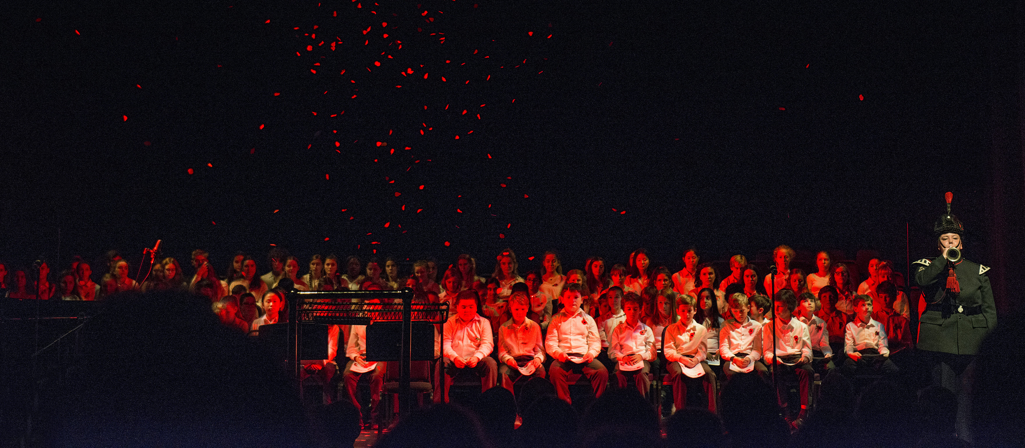 The first half concluded with the last post – the audience rose to their feet and stood for the two minutes silence while red petals drifted and tumbled onto the silent choristers below.”