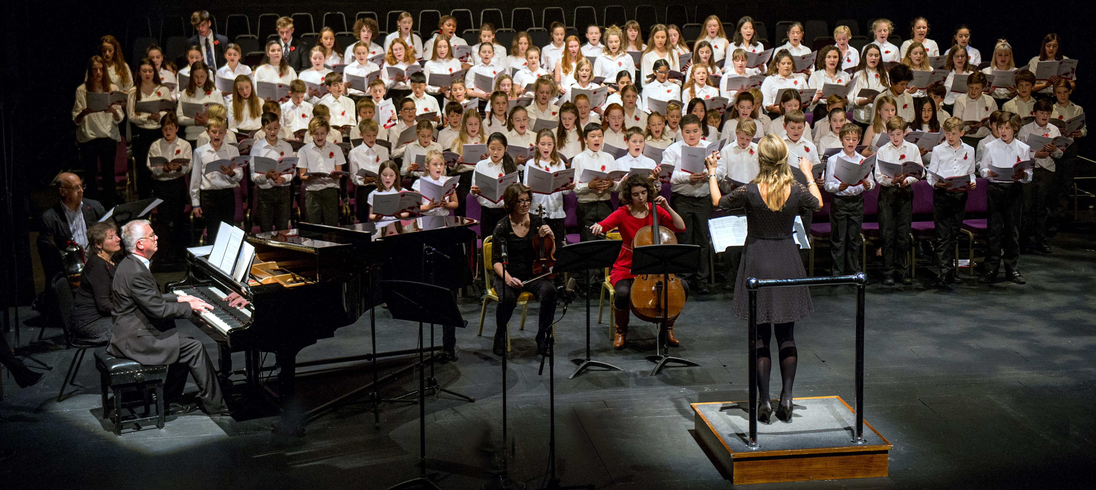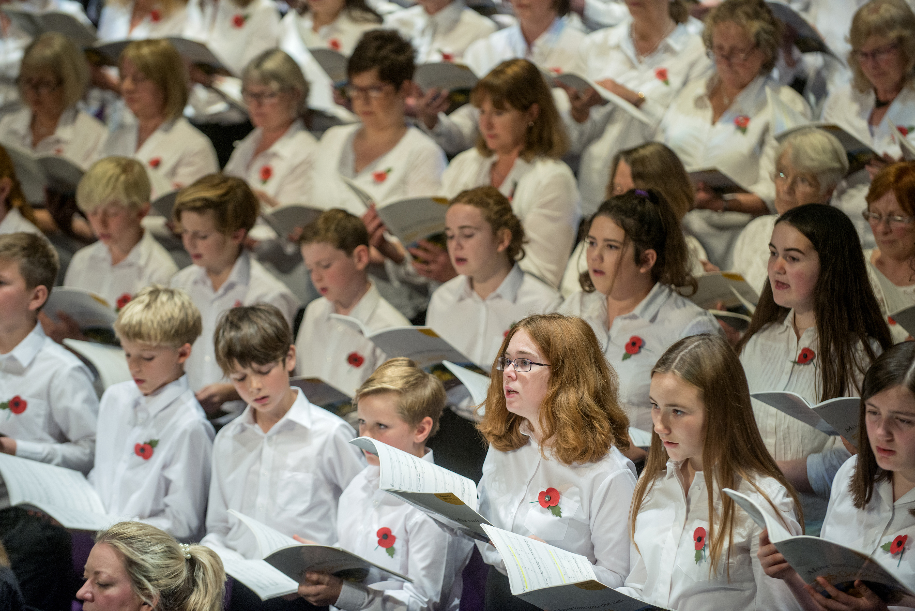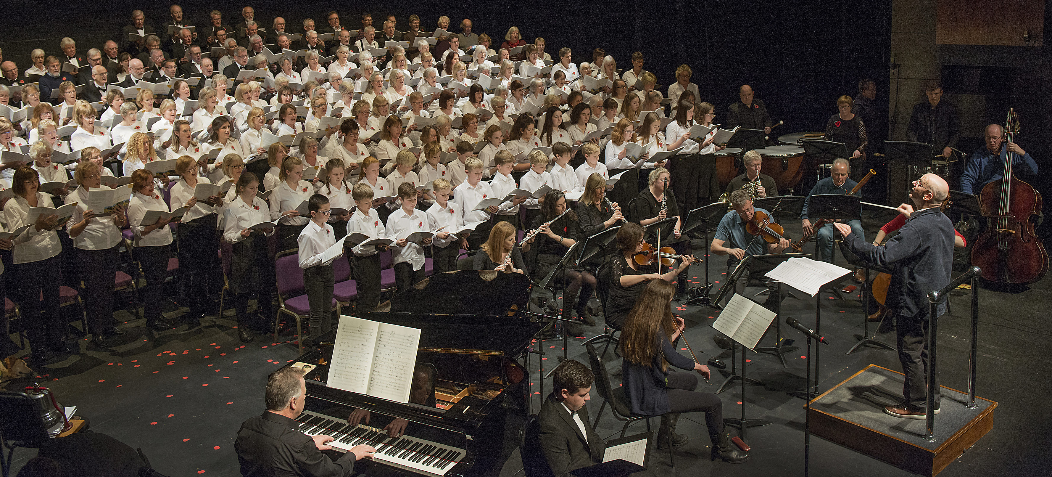 The first half concluded with the last post – the audience rose to their feet and stood for the two minutes silence while red petals drifted and tumbled onto the silent choristers below.